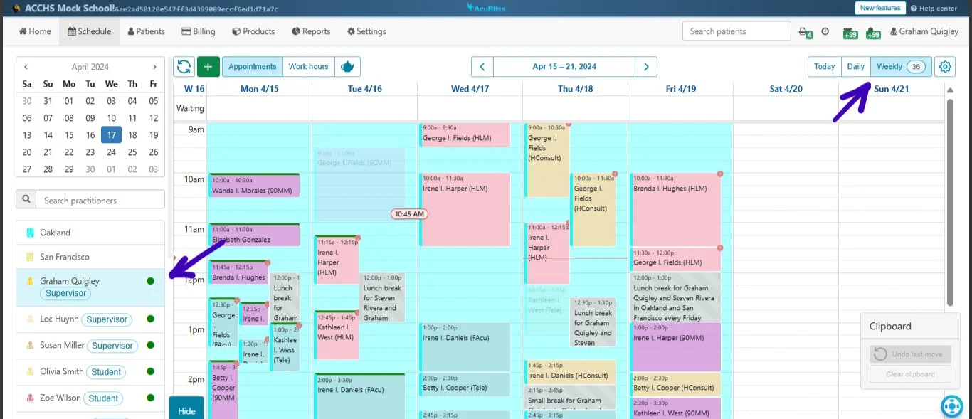 Click on specific practitioners to view schedule for only them